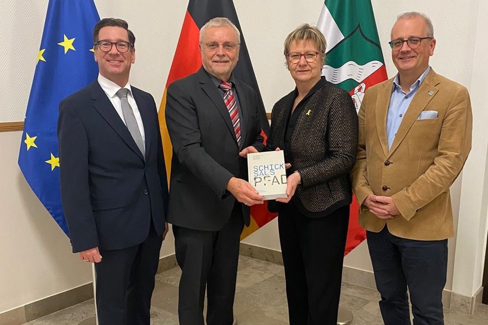 Auf Einladung von Sylvia Löhrmann, Beauftragte des Landes Nordrhein-Westfalen für die Bekämpfung des Antisemitismus, für jüdisches Leben und Erinnerungskultur, waren die Herausgeber des Buchs „Schicksalspfad“ zu Gast in der Düsseldorfer Staatskanzlei. Daniel Wienold (Leiter der Emmy-Noether-Gesamtschule), Carl-Wilhelm Bienefeld und Brudermeister Frederick Krüll sprachen dort ausführlich mit Sylvia Löhrmann über das Projekt.