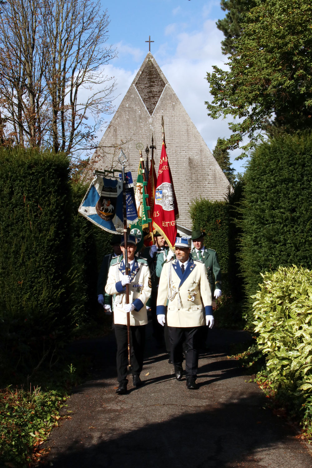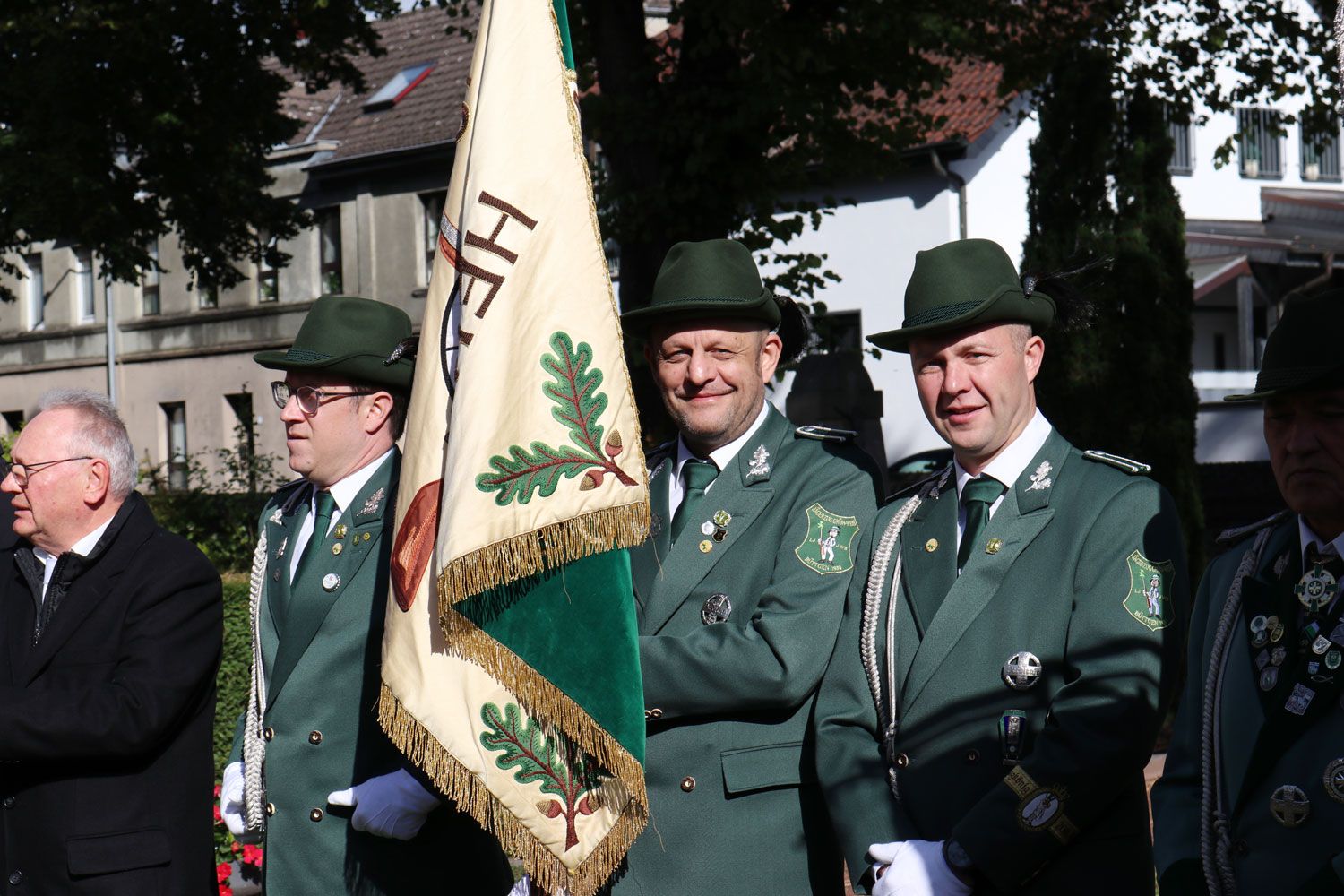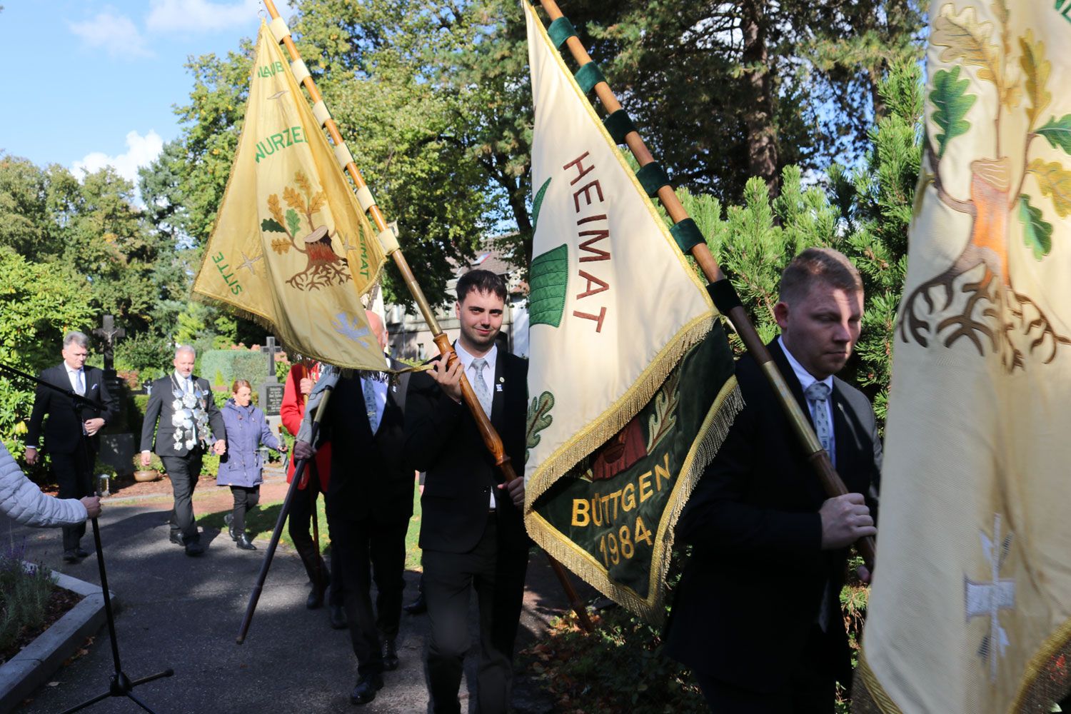 Zum feierlichen Abschluss der Maßnahme hatte die St.-Sebastianus-Schützenbruderschaft Büttgen Anfang Oktober zur Einsegnung des Hochkreuzes alle Sponsoren, Schützen und interessierten Bürger eingeladen. Der Himmel war blau, die Sonne schien und auch das Priestergrab erstrahlte nun in neuem Glanz. Im Beisein unter anderem von Schützenkönig Jörg Michael Krause und Steinmetz Harald Kuhn spendete Diakon Hermann-Josef Krause den Segen für das restaurierte Hochkreuz. Im Anschluss lud Brudermeister Frederick Krüll alle Gäste noch zu einem kleinen Umtrunk in die Pampusschule ein, wo er allen Beteiligten und Sponsoren nochmals für ihr Engagement dankte.
